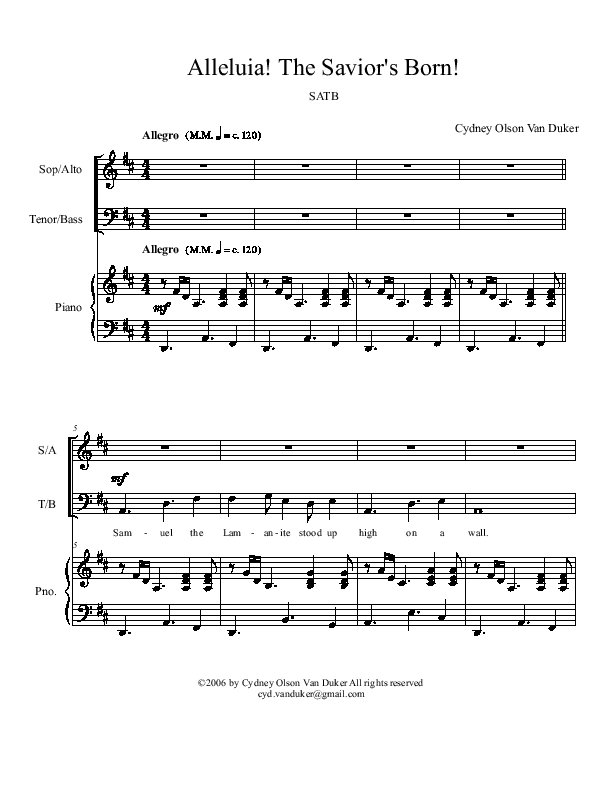 Alleluia! The Savior’s Born!This lively Christmas song has a Caribbean feel. It uses references from the Bible and the Book of Mormon. The parts are not hard at all. The men and women each sing part of each verse and come together to sing Alleluia! The Saviors born! on the chorus. If you want to jazz it up a bit, try using a string bass to pluck along with the pianos left hand, and maybe some bongo drums to play the rhythm of the pianos right hand. Add some shakers too! This song will be a great part of your Christmas program or Cantata. The MP3 recording did not add the third verse, so the transition to the ending is not very clear. No worries!